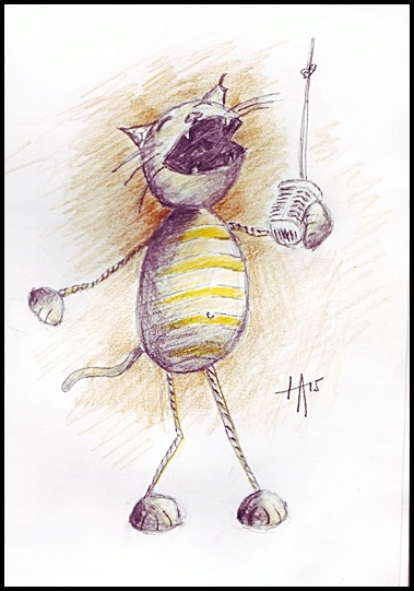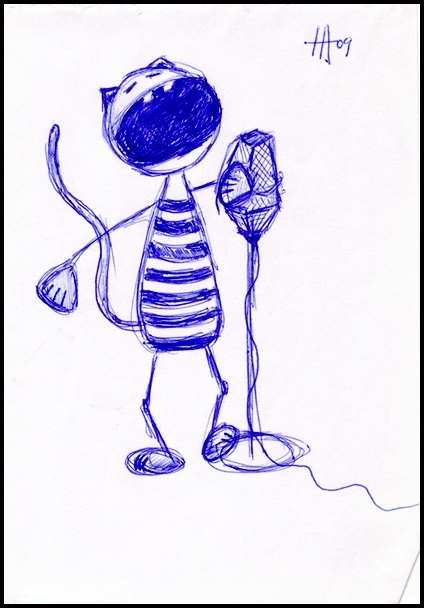 On this subject, let me share with you one of these later types. A couple of years ago I remember waking up from a dream. The image I saw was so vivid! It was a cartoon-like cat creature made out of wood, with hands and feet made out of rope. It was singing at the top of its lungs into a microphone. As soon as I was more or less awake I grabbed the closest thing to a writing instrument and started drawing frantically. Much like how I imagine Kubla Khan being created.