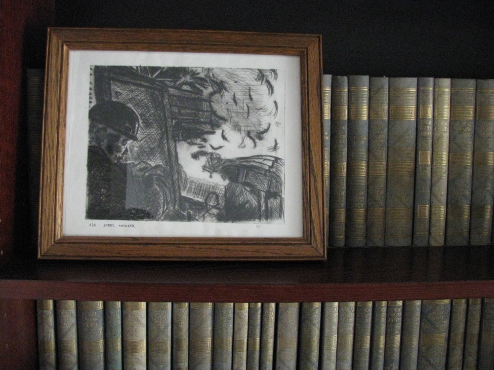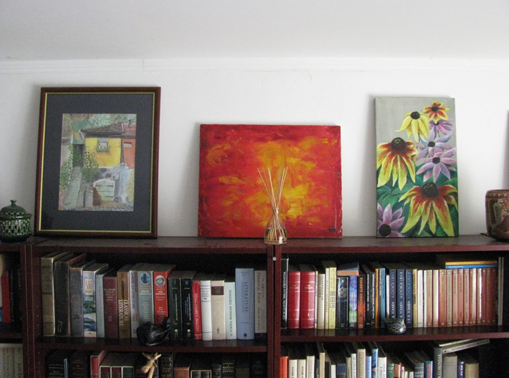 Left to right: Serb Street 7. Composition in red. Cone flowers. - Why not use the space in front of the books on the shelf? If you have a series of books where the individual volume itself is not the main focus point, place a smaller painting, sketch to draw a bit of interest. Contrasting darker books with a lighter work will further draw the eye to the piece you are displaying.