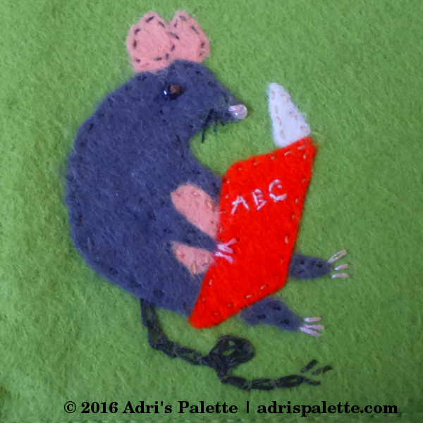 So kept thinking about the appliqué, then Crispy Bacon the mouse that I have made for my colleague, and a gift idea I was already thinking about for my nephew’s birthday. Mouse, mouse, mouse was all that kept creeping around in my thoughts. All of a sudden I saw the picture of a little mouse reading a book in my mind.