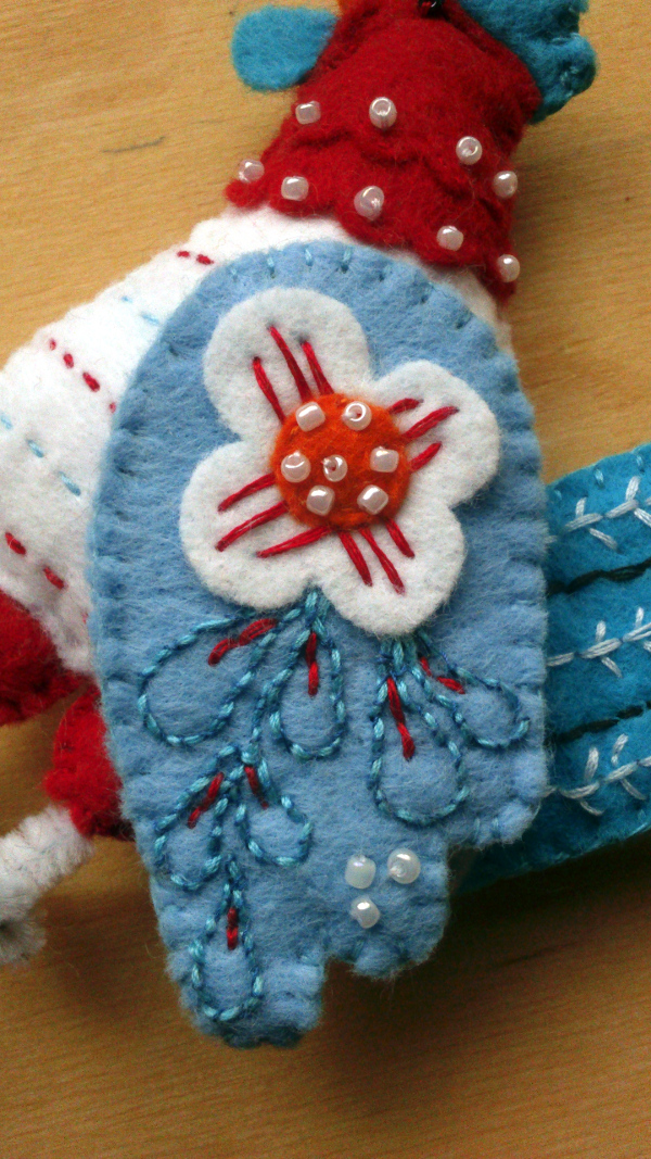 At first, when I was just looking at the pictures, the hen’s colors seemed a bit strange. I was not entirely sure about the combination of the different blues and the red, but decided to trust the design blindly and go with the flow. And I must say I am glad I did, because I love the end result. The combination of the delicate blue of the wing, the slightly darker tail with its contrasting embroidery and the white body is beautiful!