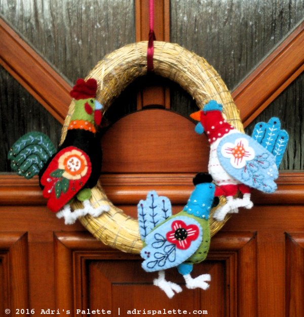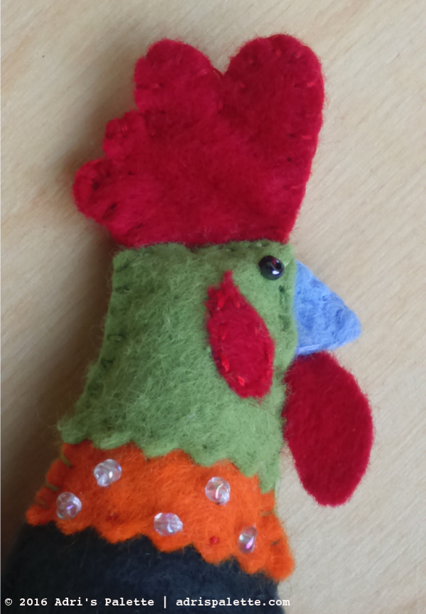 I debated a lot on the colors for the rooster, so I decided to take things slow. I took it section by section. I started with the head. I wanted it light, but colorful. Playful and happy. I definitely wanted some harmony with the French hen, so I looked at the color combinations in them. When I was finally confident with my colors only then did I start thinking about the rest of the body. What would match the light green and the orange? What are those areas that I want to highlight and show off? What are those that I don’t want to contradict with another part?