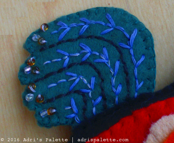 I already decided to have the wing of the rooster stand out and be more elegant then that of the French hen. I was thinking about bringing in some folk elements from my previous drawings and embroider it, but then had another idea. I once saw a very pretty needlebook cover design on Larissa Holland’s blog. As it had a similar feel to the design on the hen’s wings, but was more bejewelled I though it would be perfect. I absolutely love the end result.