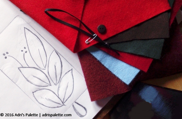 I decided upon a design of simple leaves and just a touch of embroidery. A touch, because I’d like the focus to be on the colors, not the design itself. I wanted the colors to be harmonious, yet have something of the unexpected. I researched some color designs on Color Collective (if you ever need inspiration on color harmonies you have to see this site) and fell in love with the concept of adding a shock of aqua blue to the earth tones, the reds. The base felt I chose for the cozy is a rich, dark berry color. Complementing it the other felts are in the red color family that ultimately create an ombre effect. And then there will be a leaf in (my favorite) aqua color.