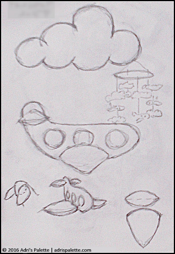 I saw a lot of pictures from left, right, the top, the bottom, but no pattern that would explain how I should do it. So I started thinking and doodling, and I think I figured out how I will make it. So with the idea in hand and a huge smile on my face I sat down with the parents to discuss the details. They really liked it, in fact were very enthusiastic. We chose the colors for the planes, the design of the clouds, and how it will be hung up. We even figured out what the best size of the planes and the bank of clouds I imagined floating around them would be.