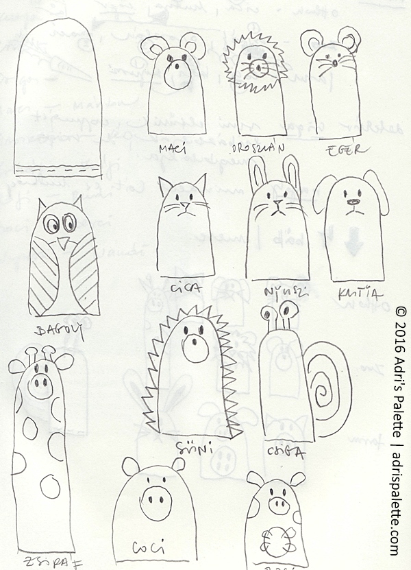 The good thing is that I now have an outline for a story that I really like, and the characters that will be the central figures in it. One thing that worries me though is that besides the general idea there is no story yet. And no drawings to go with it (gulp). But first things first: I’ll make the little puppets because I am sure the colorful little creatures will give me the inspiration I need!