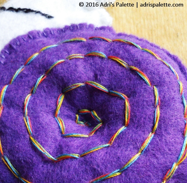 I ended up stitching a little spiral around the shell with multicolored threads. I chose four different colored sewing threads that were bright and fun, and would contrast with the lilac of the shell. At first I thought it would be wonky, but it turned out to be pretty good right on the first go.