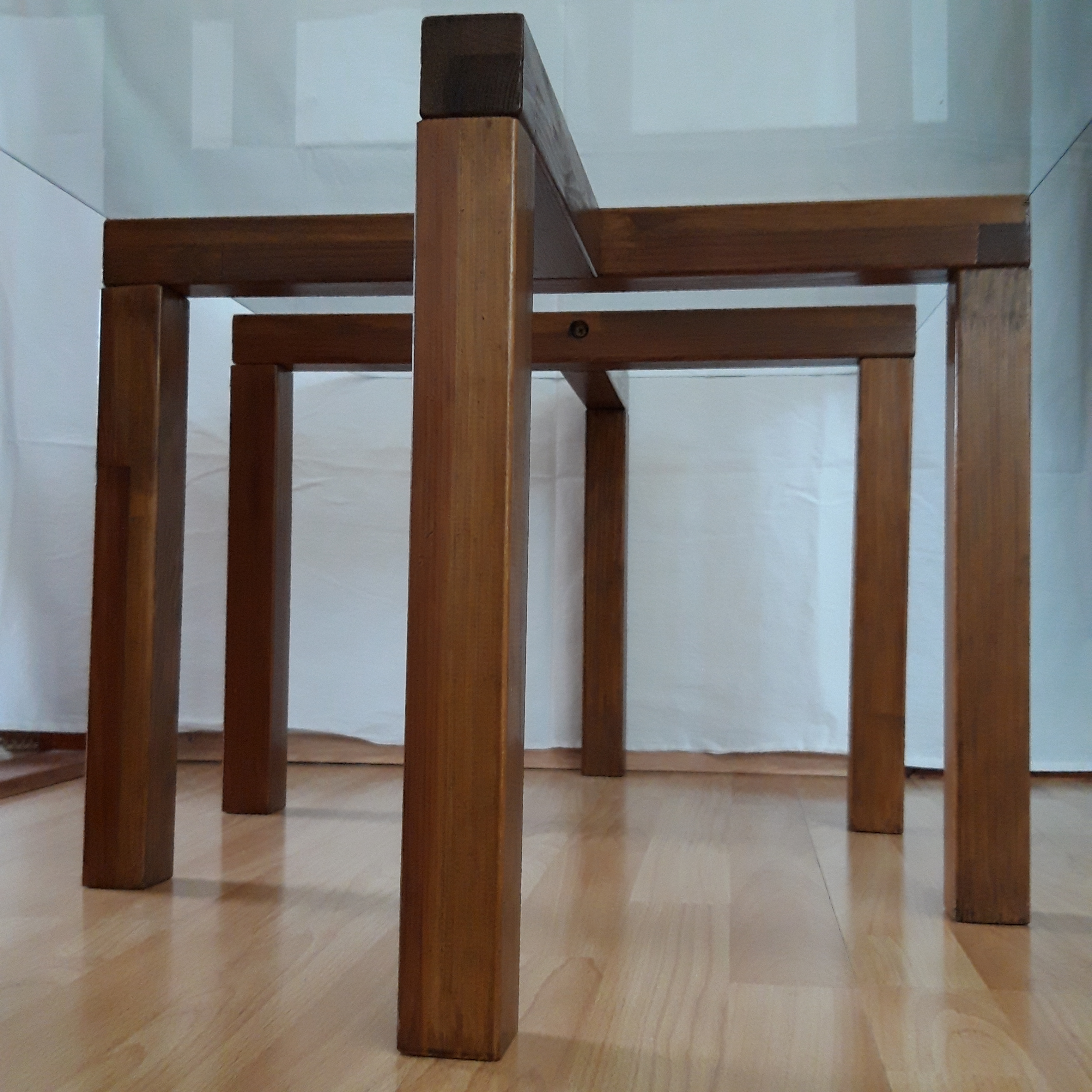 But to give you an idea, I cut 5 pieces of wood for each set of the legs. There are three individual legs that are held together by the top. This is made of two pieces joined together in a T-shape. I drilled a couple of holes, put in some screws, did a bit of sanding and varnished the legs a nice walnut color. Repeating these steps I ended up with the two sets of table legs.