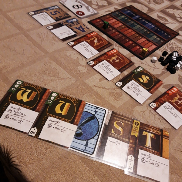 Having also played some abstracts over the weekend (see the full list at the end of the post) I craved a word game. I already mentioned previously how wonderful Hardback is. And lo and behold, this is the one both of us thought of immediately. With its tongue and cheek humor, with the fact that you can control the luck of the draw with the ink tokens and that there are 5 variants to this deck builder it is guaranteed never to disappoint. And for better or wurst (so sorry, but I just had to. I won 11 point with this word in the last round!) it is a far superior game to Scrabble.