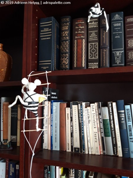 Technique wise I cut the foam to shape with scissors. I then covered every bit of the mouse with masking tape. With the same tape I was able to adjust the shape of the core as needed. The surface of the sculpture itself is made with the spun cotton technique. I used this tutorial. The cheese is made from a cardboard base using much of the same techniques. The mice and cheese where then primed and painted with acrylic paints.
