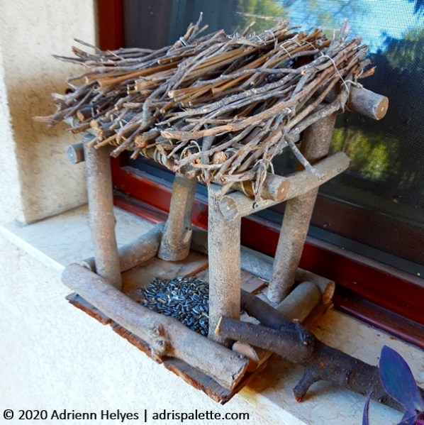 Recently I was tending to the rose bush next to it when I noticed again how dilapidated it looked. The entire structure seemed wobbly and the twig roof was coming apart. Every time there was a strong wind I’d find pieces of it lying around on our terrace. To be honest, it looked gray and old. And no wonder, if I think about it, it is now 12 years old! So finally, I decided not to wait another season, and gave myself the task to mend the little feeder.