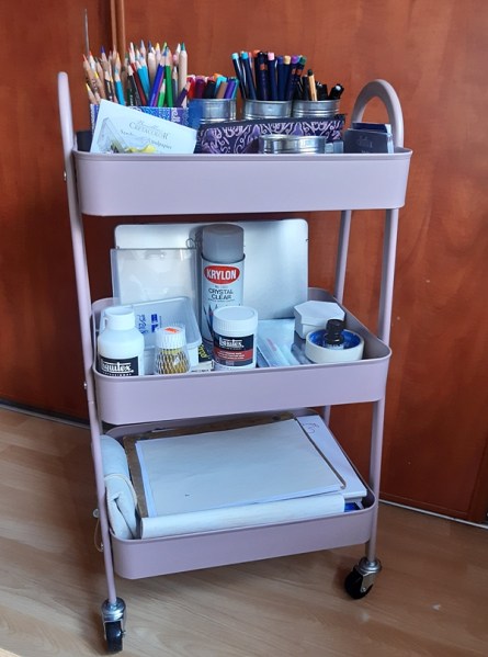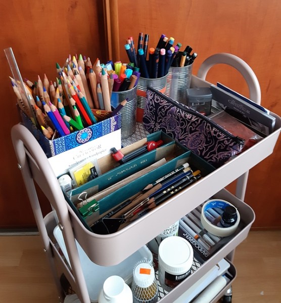 I know at first glance it doesn’t look like a huge improvement. Or an improvement at all. But here is the thing. Each trolley has a dedicated purpose. So if I am in the mood to draw I roll the little trolley out, set it up next to me, and presto! I have everything (and I mean every-little-thing) I need to draw. Even the things I’ll think of 2 minutes from now. And the things I’ll need in 3 minutes. And 5 ….